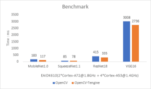 OpenCV 深度學習模組 (OpenCV DNN) 包含跨平臺的深度學習推理演算法實現,包括 ARM 支援。但這種實現缺乏深入的效能最佳化。為了增強 ARM 上的 DNN 推理效能,從 OpenCV 4.3.0 和 3.4.10 開始,OpenCV 使用 Tengine 庫作為 ARM 的高效能計算庫。效能改進在下圖中顯示