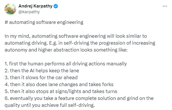 正如特斯拉前 AI 主任 Andrej Karpathy 引用的話:“在我看來,軟體工程自動化看起來類似於駕駛自動化。” 他接著說,軟體工程正在發生重大變化。它將涉及更多監督自動化,同時以英文提供高階命令、想法或進展策略。