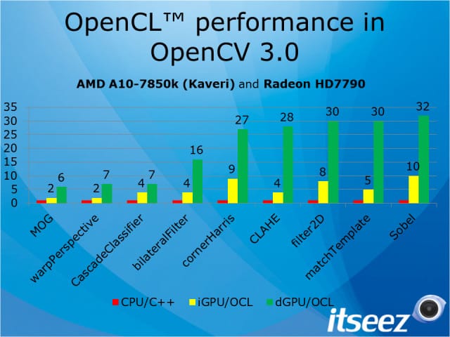 在 OpenCV-3.x 中,架構概念已更改為所謂的透明 API (T-API)。在新的架構中,獨立的 OpenCL 加速 cv::ocl::resize() 從外部 API 中刪除,併成為常規 cv::resize() 中的一個分支。當從效能角度來看,此分支在可能並且有意義時會自動呼叫。T-API 實現由 AMD 和 英特爾 公司贊助。